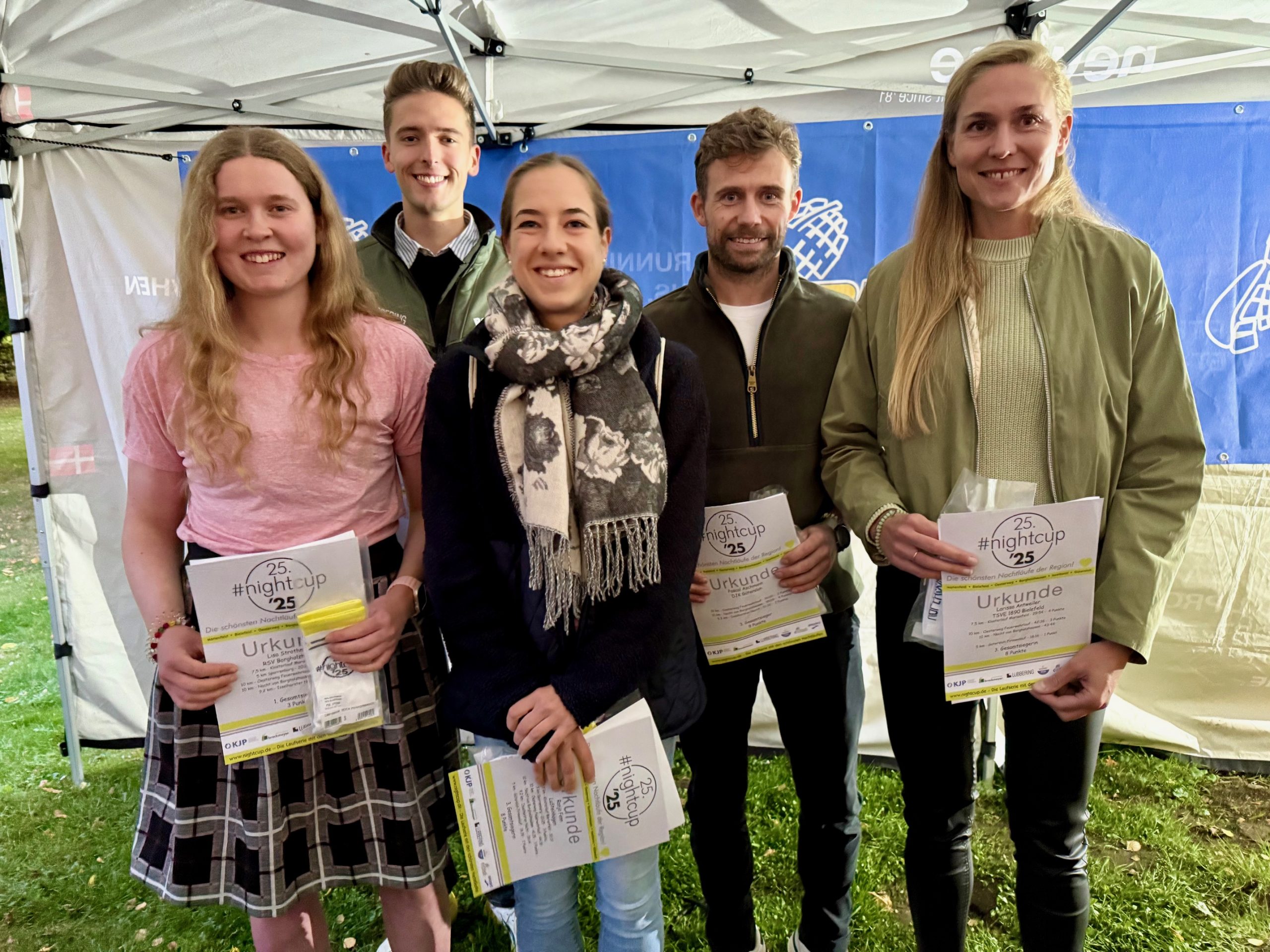 Nightcup 2025: Lisa Strothmann (v.l. und Julian Borgelt (2.v.l.) wurden bei Hohenfelder als Gewinner der Nightcup-Laufserie ausgezeichnet, Ronja Fenn, Pascal Aschmann und Larissa Antweiler landeten in den Top-3.